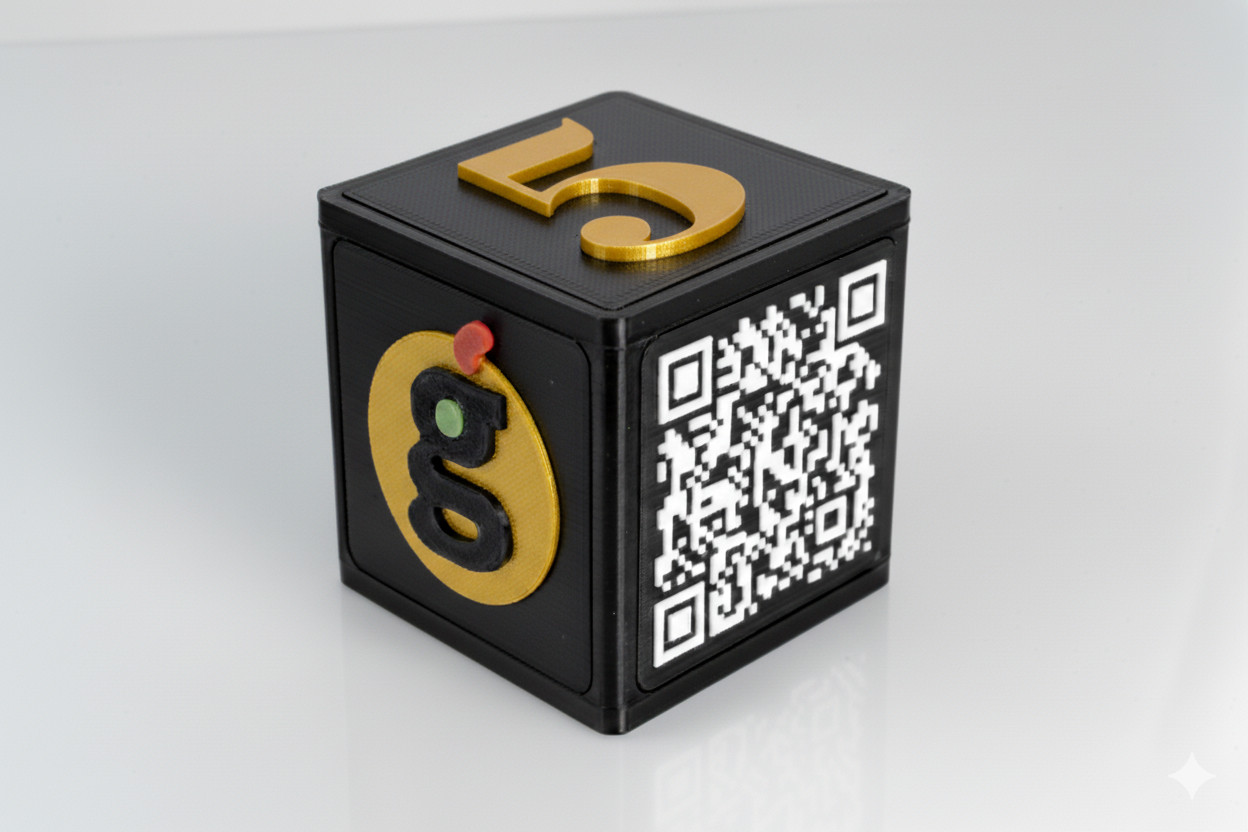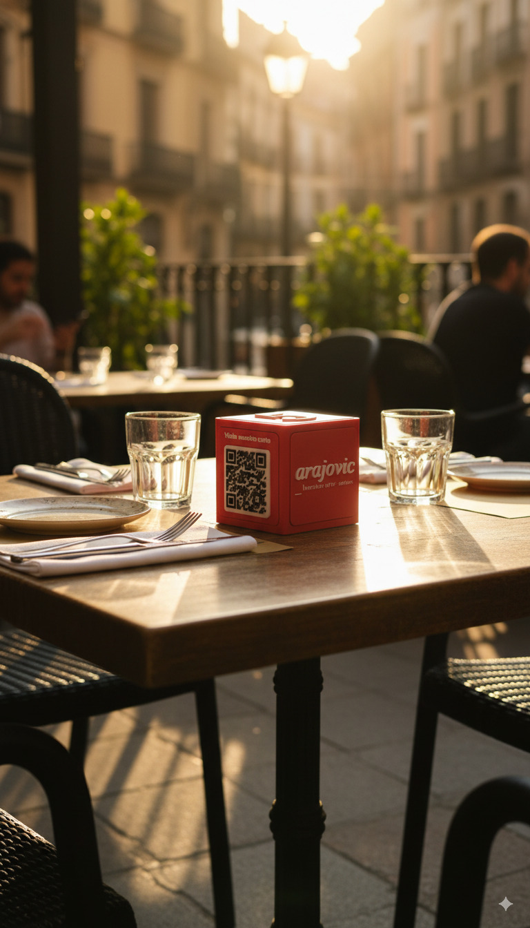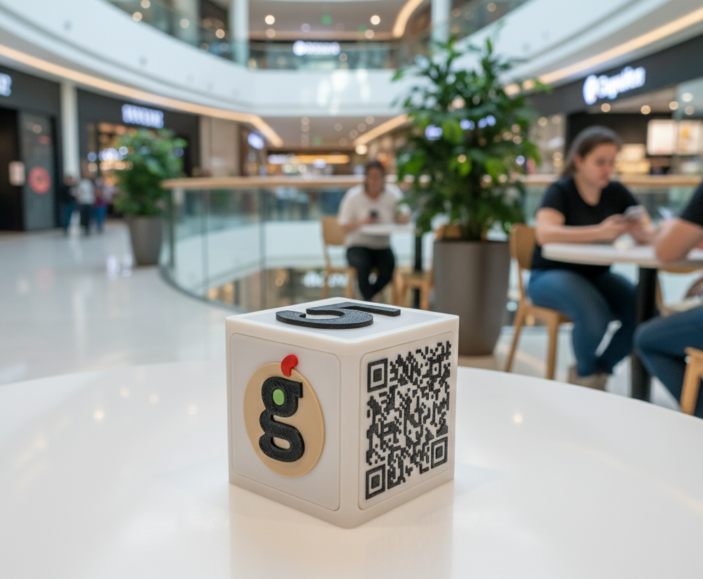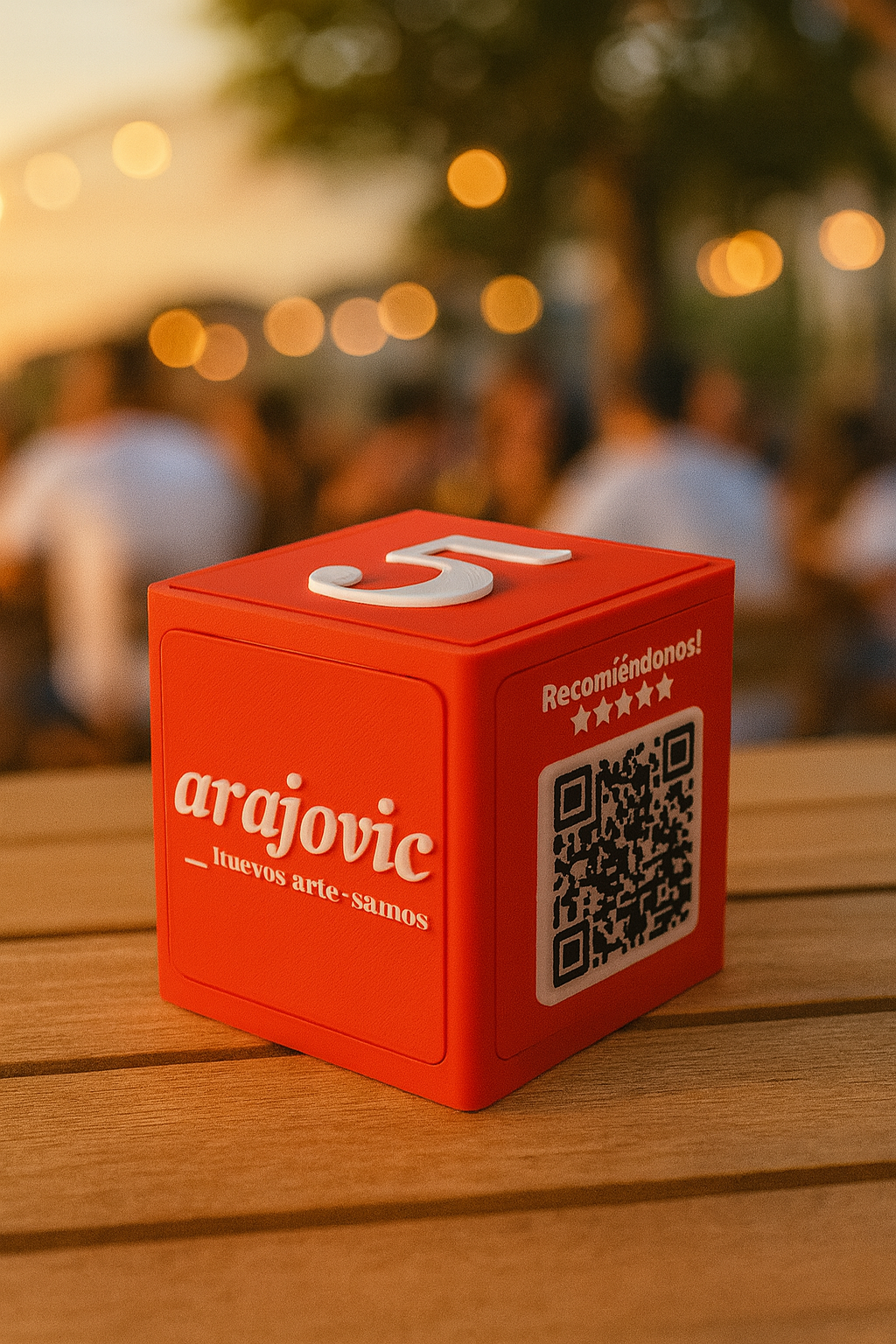 GastroCube es un soporte publicitario en forma de cubo con cinco caras personalizables. Ideal para logotipos, códigos QR y mensajes en barras o mesas.