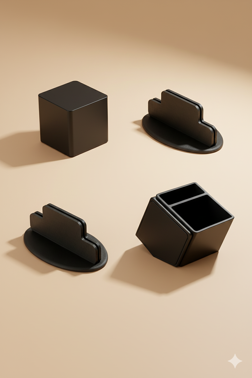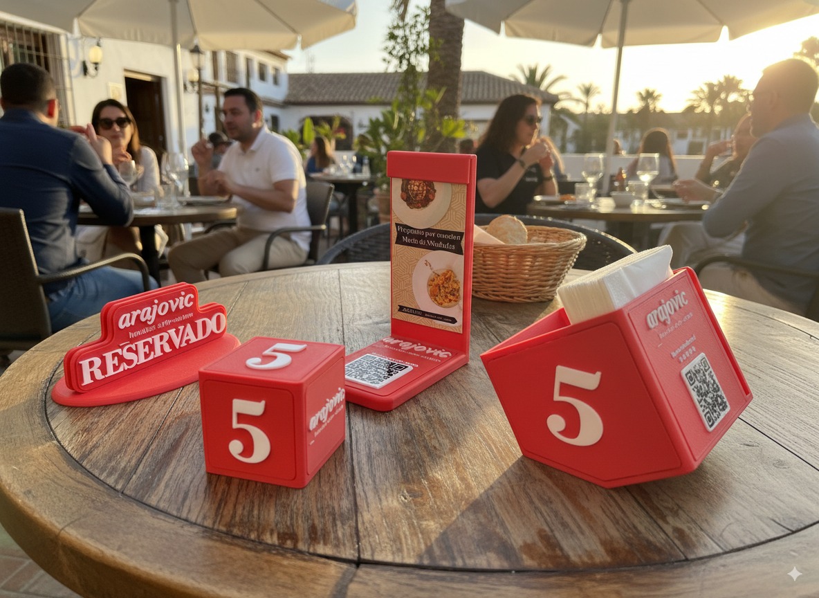 Cada pieza está diseñada para estar presente, para comunicar, para quedarse en la mesa. Impresos en 3D, pensados para hostelería y listos para convertir cualquier rincón en un punto de impacto.
